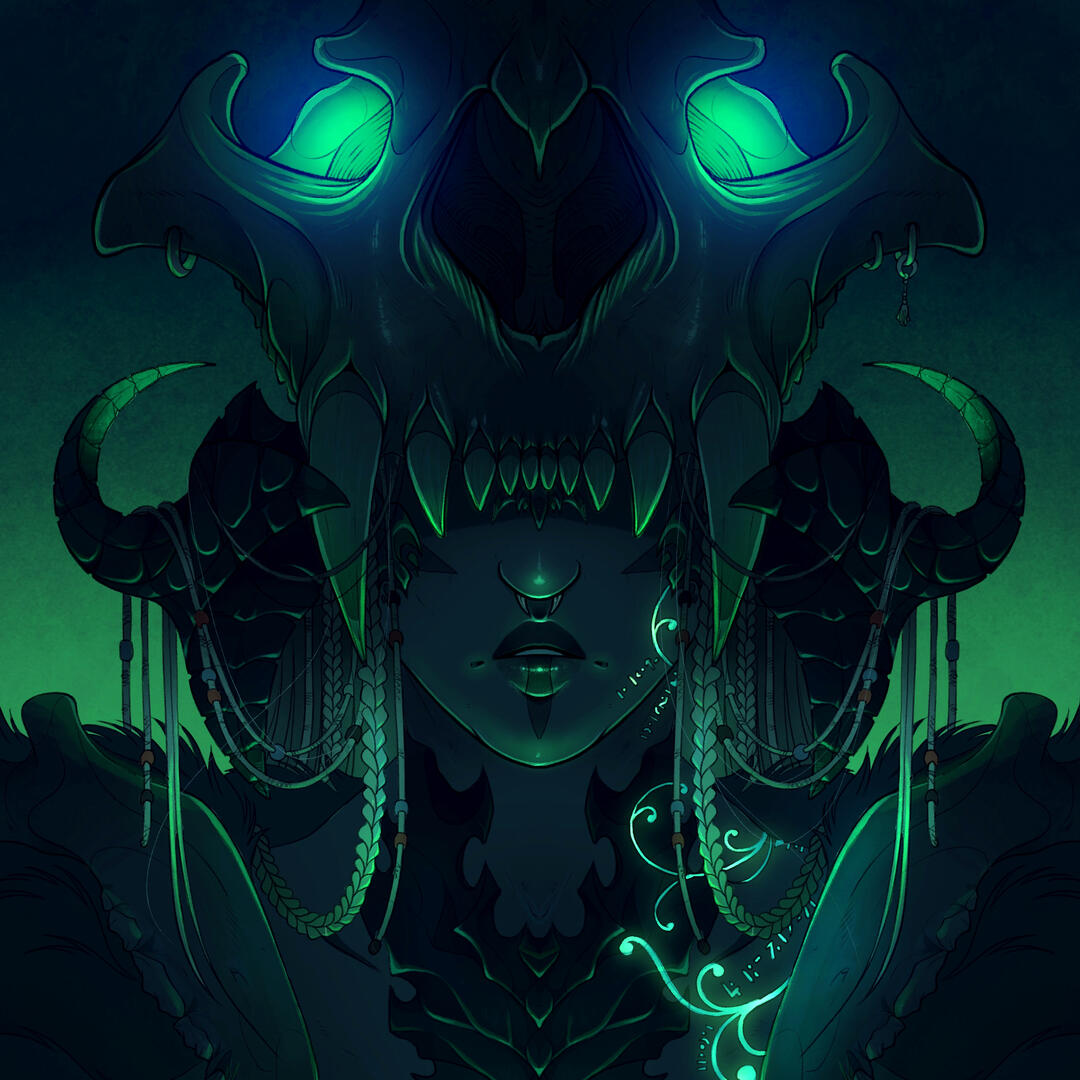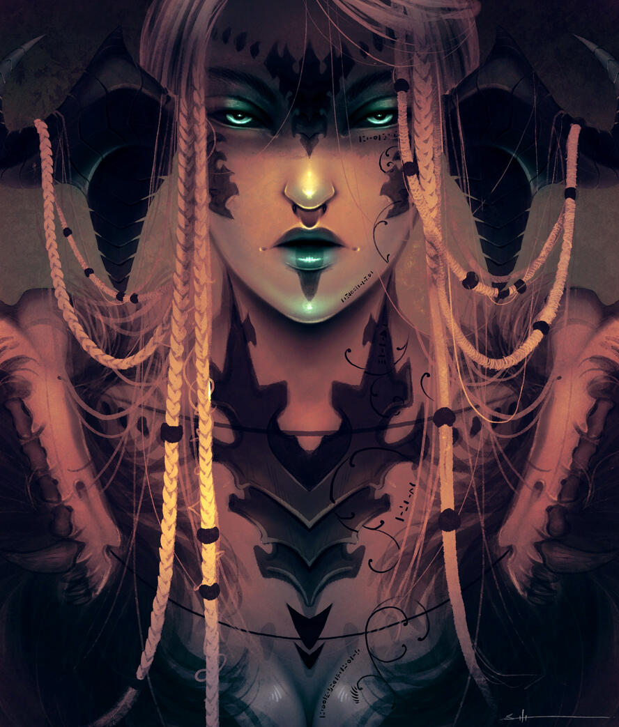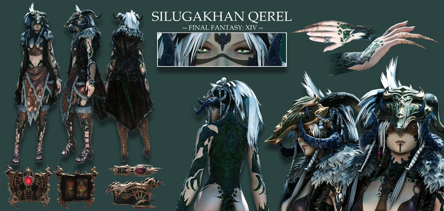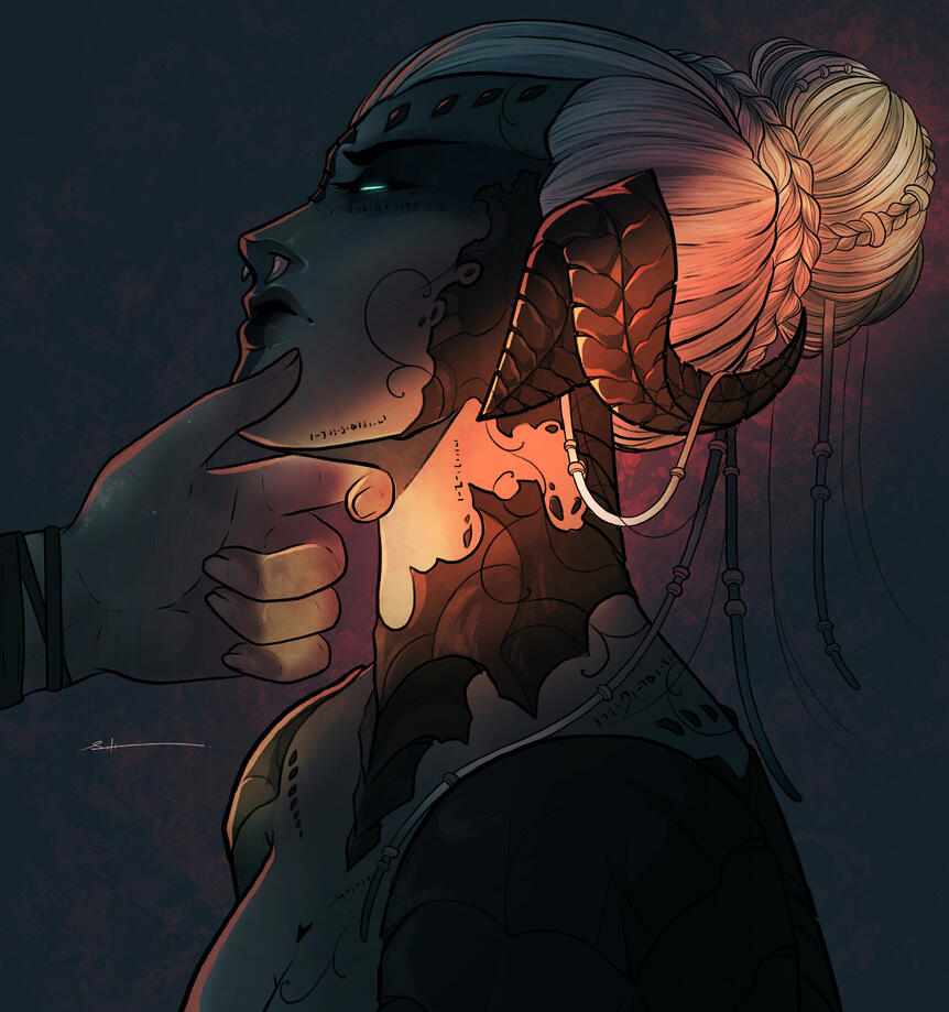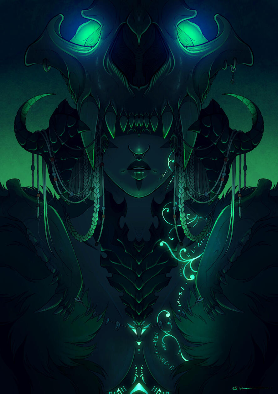 Born trained to become a Moks, childhood and early adult life situated within the Qerel, Silugakhan is a born and trained killer. She hunts for sport, and kills for work. Always dressed in loose and barely-there clothing to keep her motions free, the Xaela is also decorated from head to hips in the bones and remains of the beasts she has slain - a tiger's maw atop of her head and teeth and jaws protecting her shoulders.Spanning an impressive height of 6 fulms and 6 ilms and roped in muscle, this Xaela is certainly one with strength and potential. However, whilst she carries herself powerfully, Silugakhan does not compose herself to be loud or violent in nature. Her speech is often heard in soft murmurs and quiet, low mutterings - and her movements are often slow, calm and calculated.Whilst she boasts strength, Silu's skillset lies with her affinity to aether. Born of an Ugdan bloodline, she possesses an incredible amount of aether and a natural gravitation to conjuring and speaking to spirits. Silugakhan, over the years, attuned her aether and interests into summoning - if she keeps a part of what she has killed, she is able to use that as a conduit to summon their spirit back to fight for her. She also enjoys using the elements to her advantage when toying with magic. From a distance, beautiful intricate runic tattoos can be spotted marking the left side of her body, emitting a ghoulish glow when her aether is activated.However, her magical skillset does dabble in darker interests. Necromancy and blood magic are something that this Xaela has a keen interest in, and with her slightly sadistic nature, it's best to keep away from her when she's experimenting.