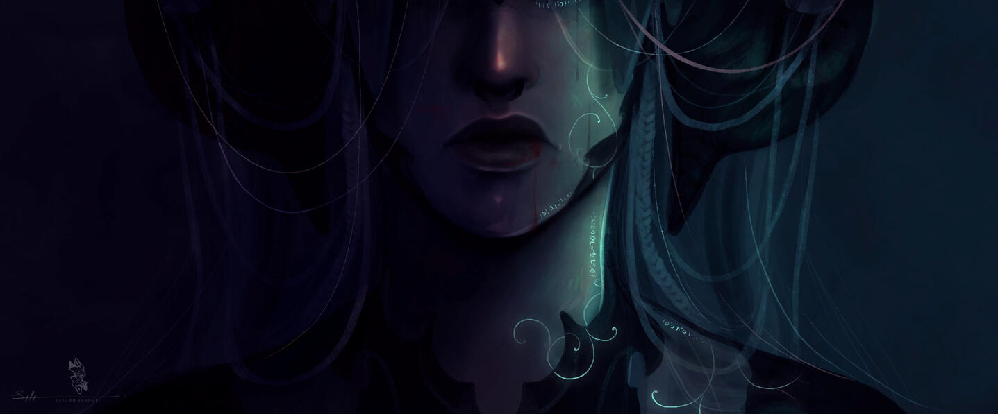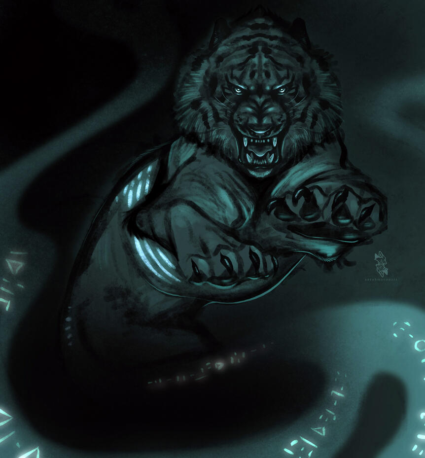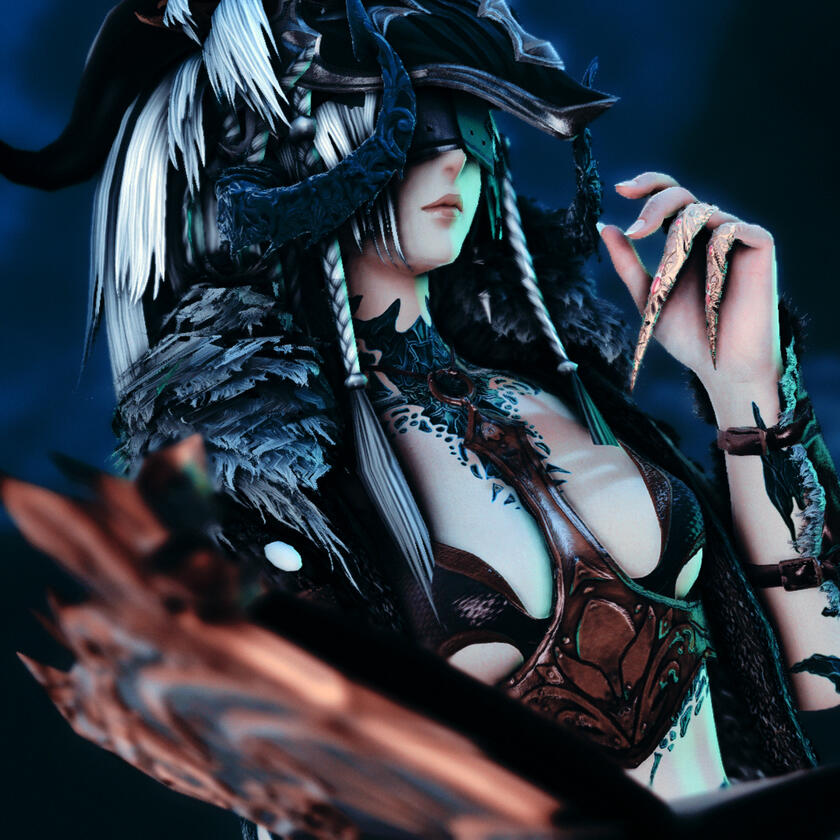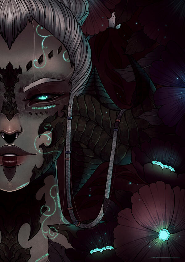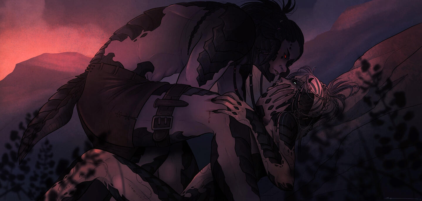 Born trained to become a Moks, childhood and early adult life situated within the Qerel, Silugakhan is a born and trained killer. She hunts for sport, and kills for work. Always dressed in loose and barely-there clothing to keep her motions free, the Xaela is also decorated from head to hips in the bones and remains of the beasts she has slain - a tiger's maw atop of her head and teeth and jaws protecting her shoulders.Spanning an impressive height of 6 fulms and 6 ilms and roped in muscle, this Xaela is certainly one with strength and potential. However, whilst she carries herself powerfully, Silugakhan does not compose herself to be loud or violent in nature. Her speech is often heard in soft murmurs and quiet, low mutterings - and her movements are often slow, calm and calculated.Whilst she boasts strength, Silu's skillset lies with her affinity to aether. Born of an Ugdan bloodline, she possesses an incredible amount of aether and a natural gravitation to conjuring and speaking to spirits. Silugakhan, over the years, attuned her aether and interests into summoning - if she keeps a part of what she has killed, she is able to use that as a conduit to summon their spirit back to fight for her. She also enjoys using the elements to her advantage when toying with magic. From a distance, beautiful intricate runic tattoos can be spotted marking the left side of her body, emitting a ghoulish glow when her aether is activated.However, her magical skillset does dabble in darker interests. Necromancy and blood magic are something that this Xaela has a keen interest in, and with her slightly sadistic nature, it's best to keep away from her when she's experimenting.
