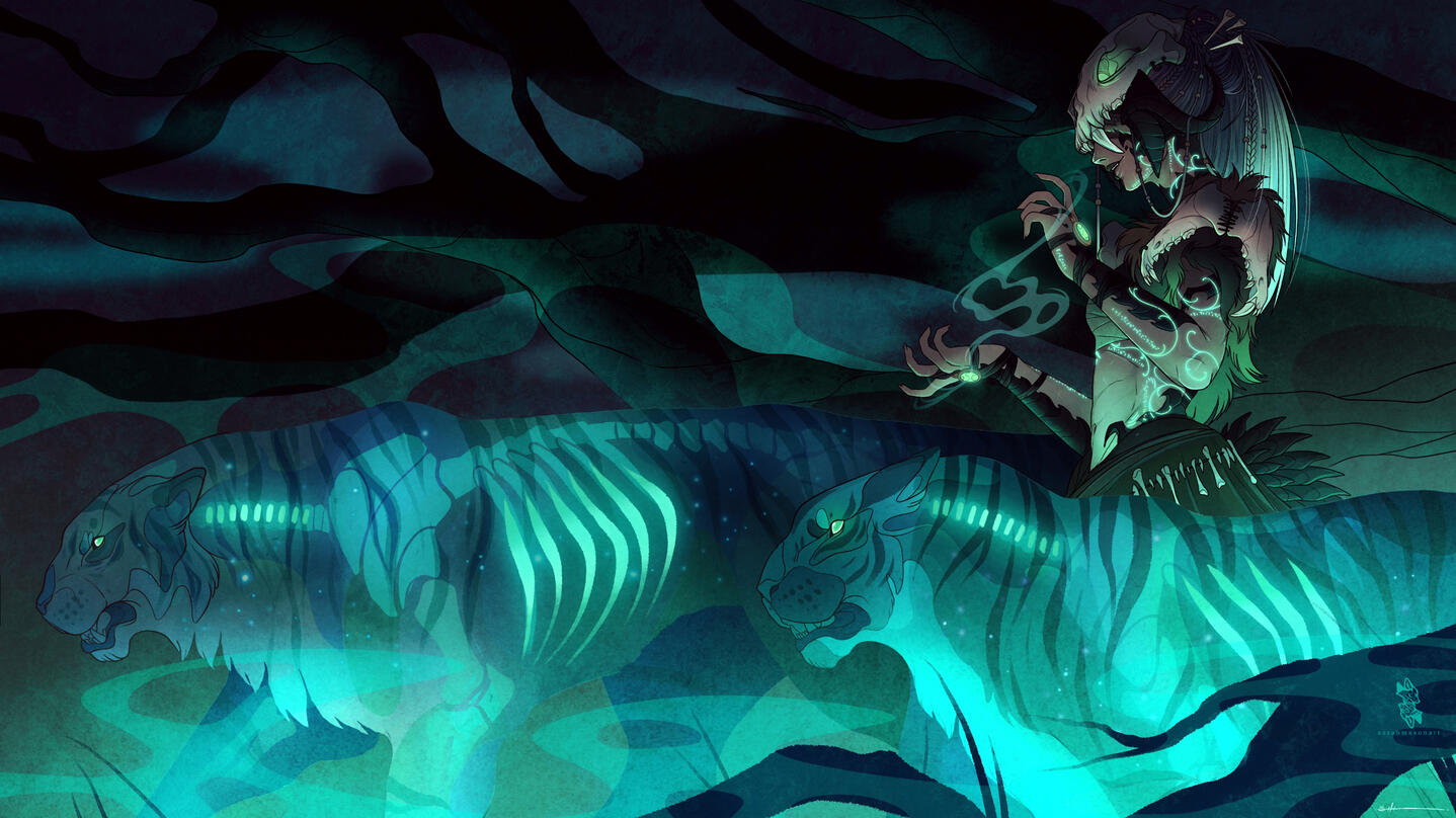 Being of an Ugdan bloodline and having spent most of her life toying with aether, Silugakhan is incredibly skilled with magic.She is a summoner, using beasts she has slain and the elements to her advantage. As a speaker of spirits, she will trap souls and keep them to do her bidding as and when needed.Those of the witchy background may take an interest in her, or fear her for her less than moral interests.